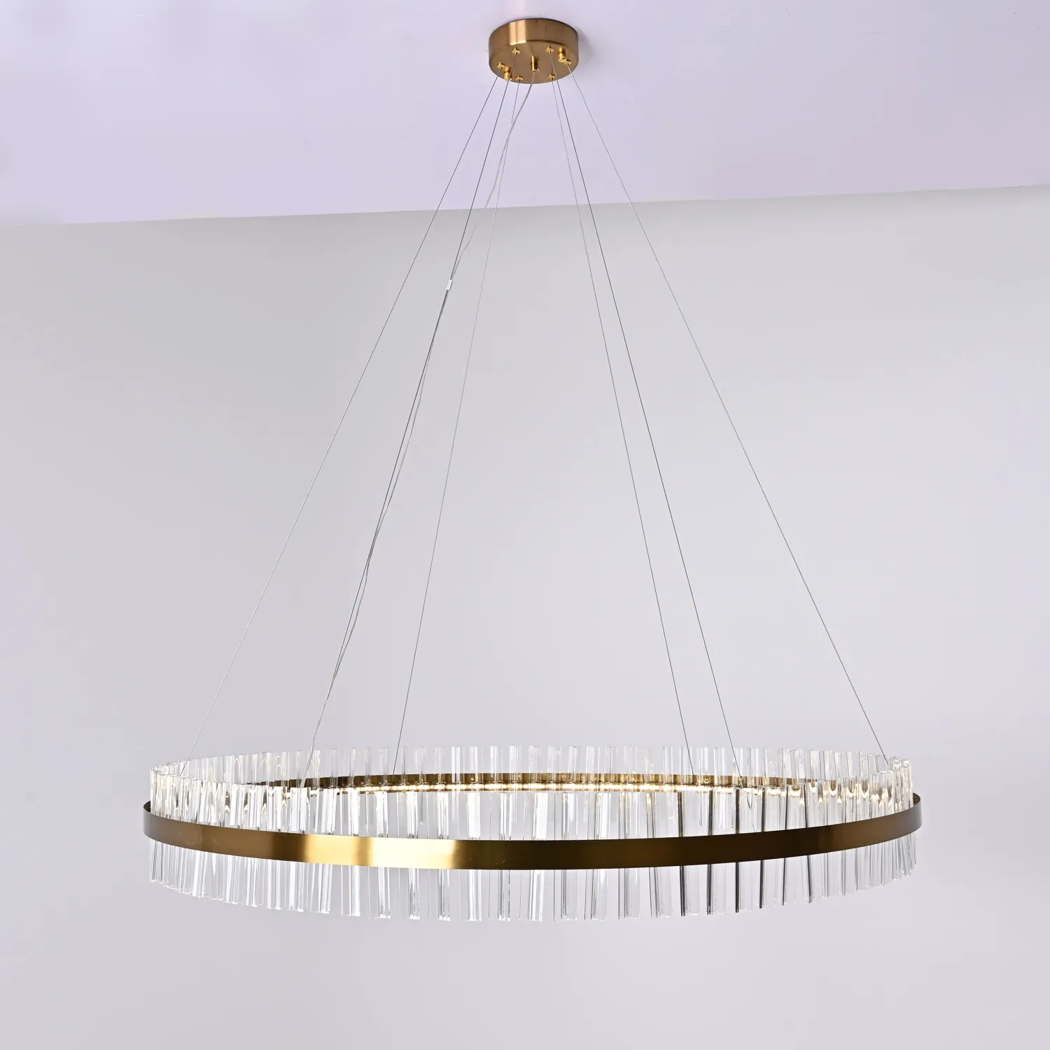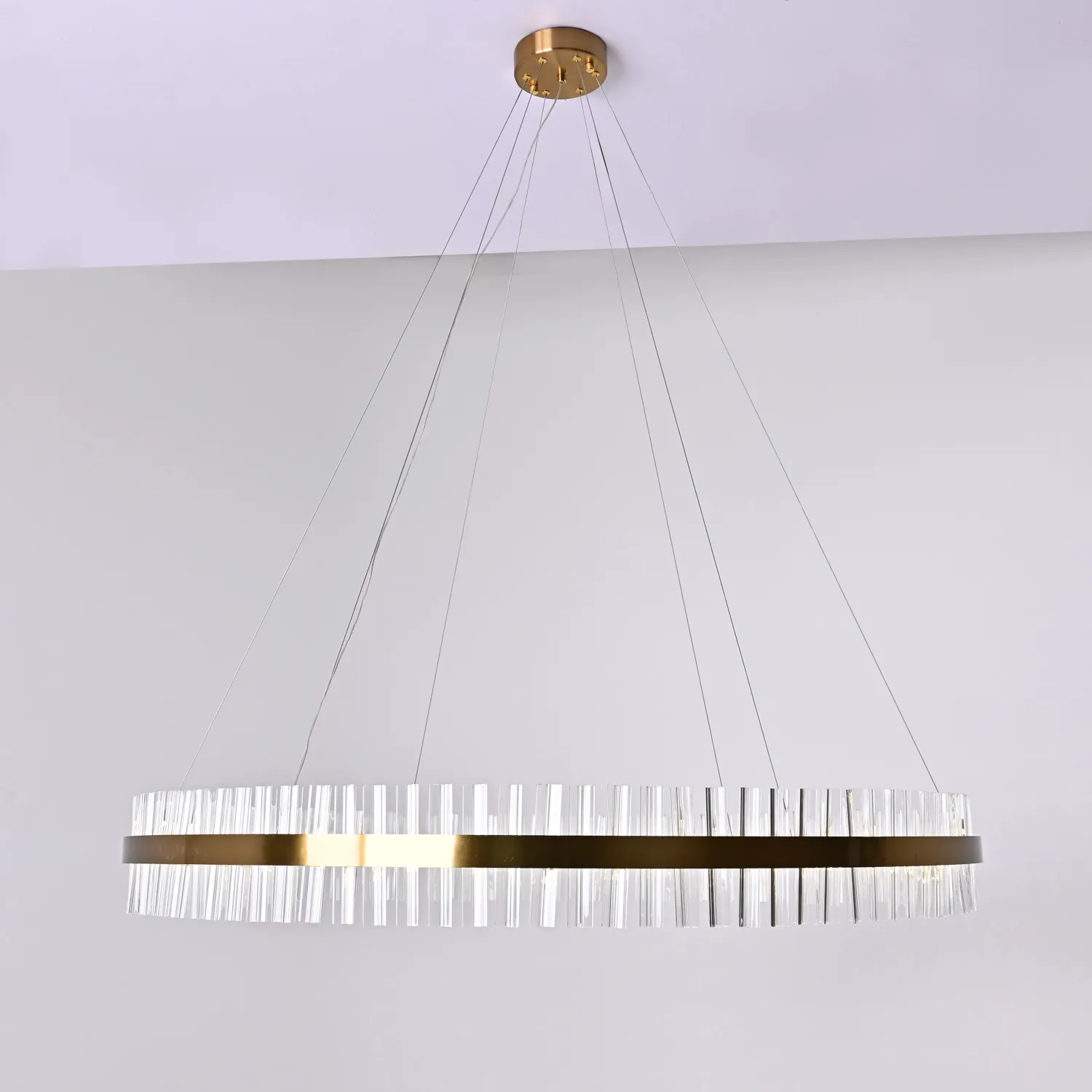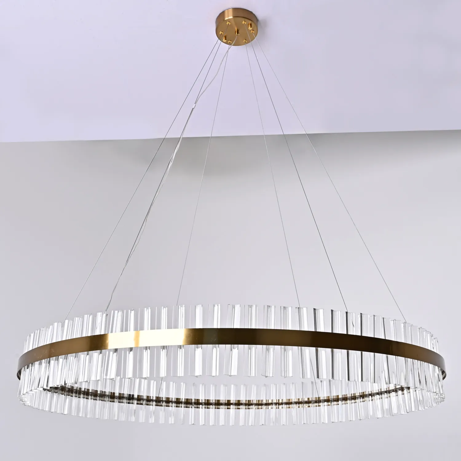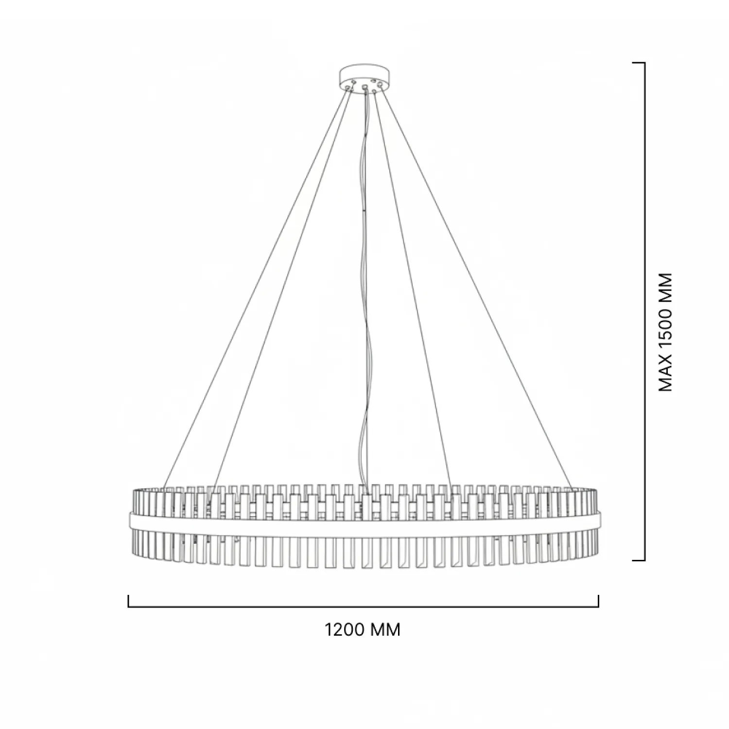 Светильник имеет круглую форму и изготовлен из прочного металла с хромированным покрытием, что придает ему элегантный и изысканный вид. Благодаря своему размеру (диаметр 120 см) он станет прекрасным акцентом в любом помещении.