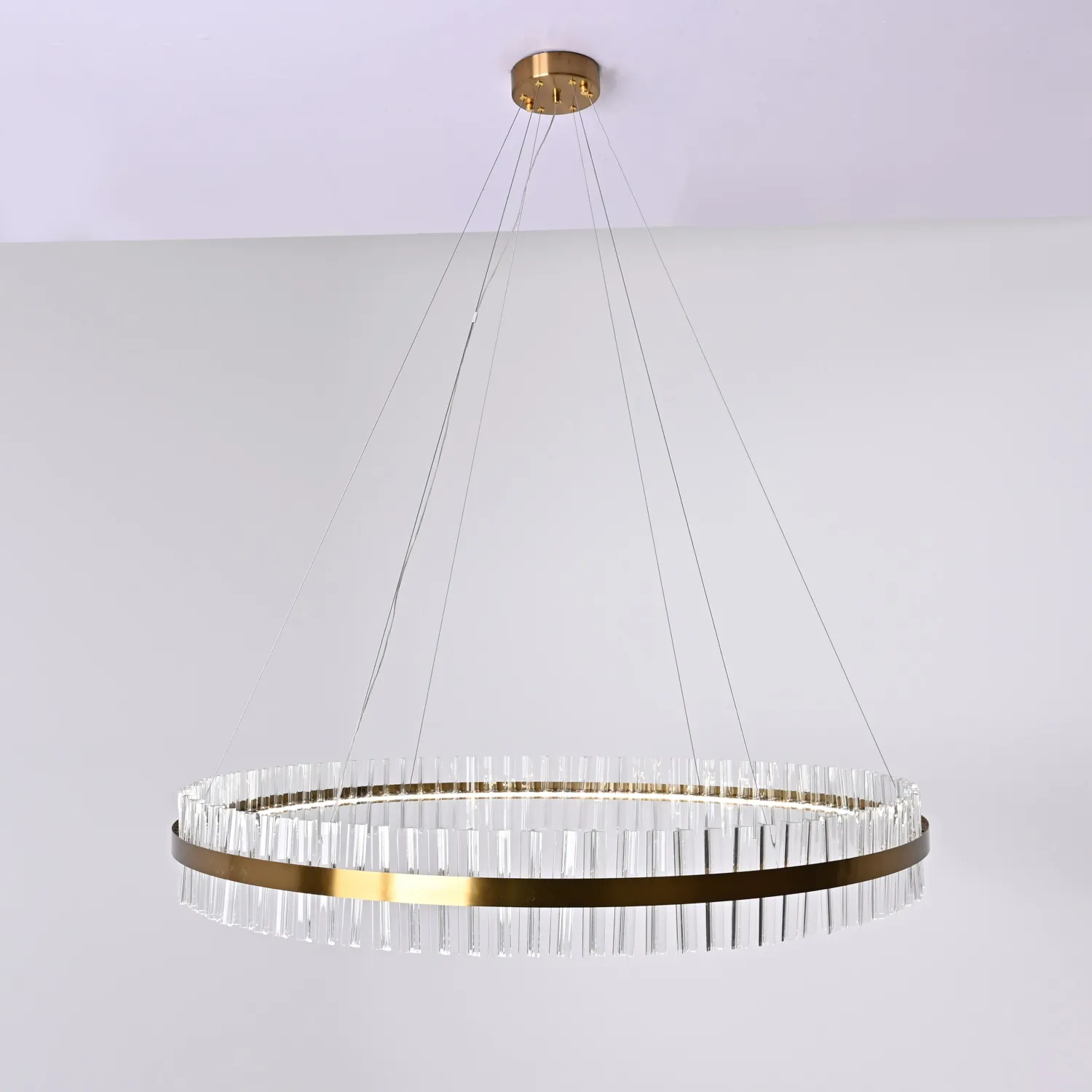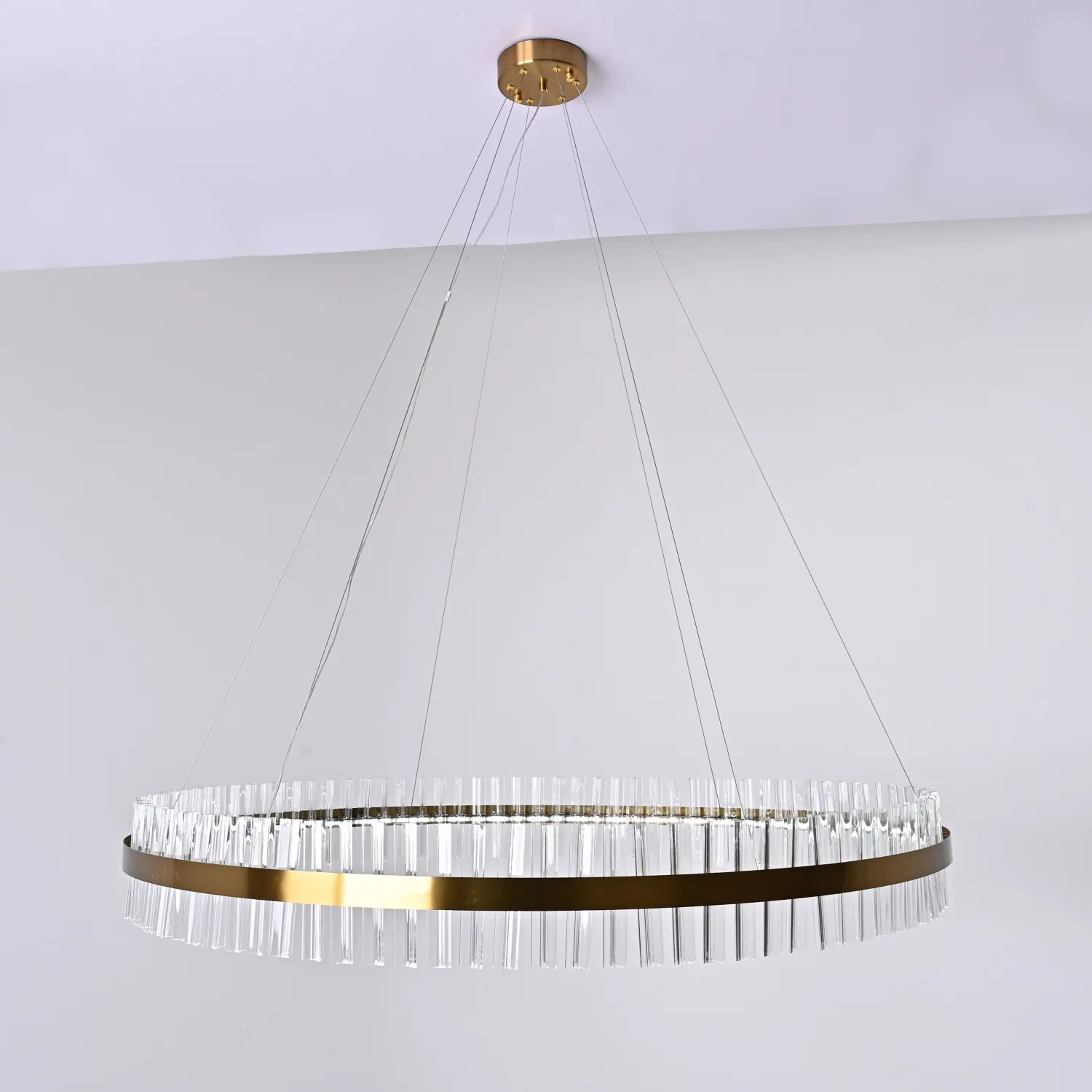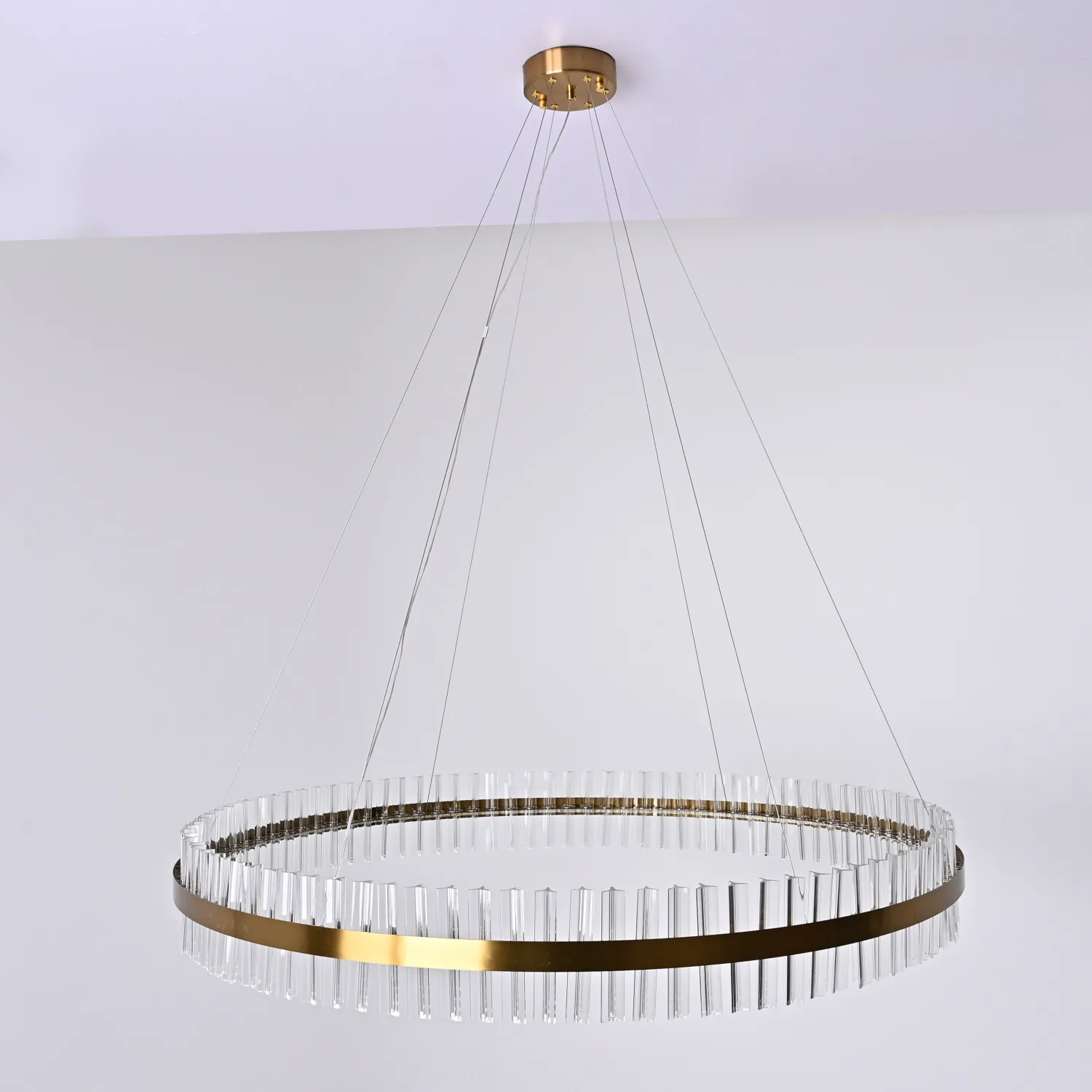 Светильник имеет круглую форму и изготовлен из прочного металла с хромированным покрытием, что придает ему элегантный и изысканный вид. Благодаря своему размеру (диаметр 120 см) он станет прекрасным акцентом в любом помещении.