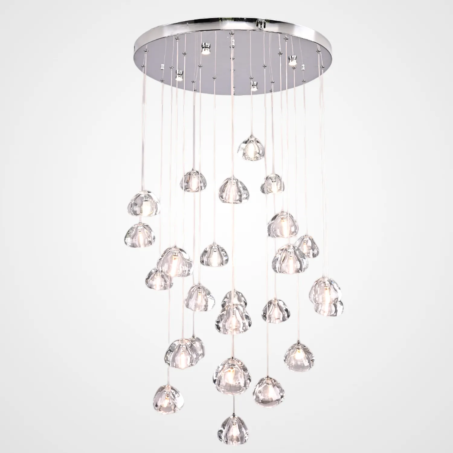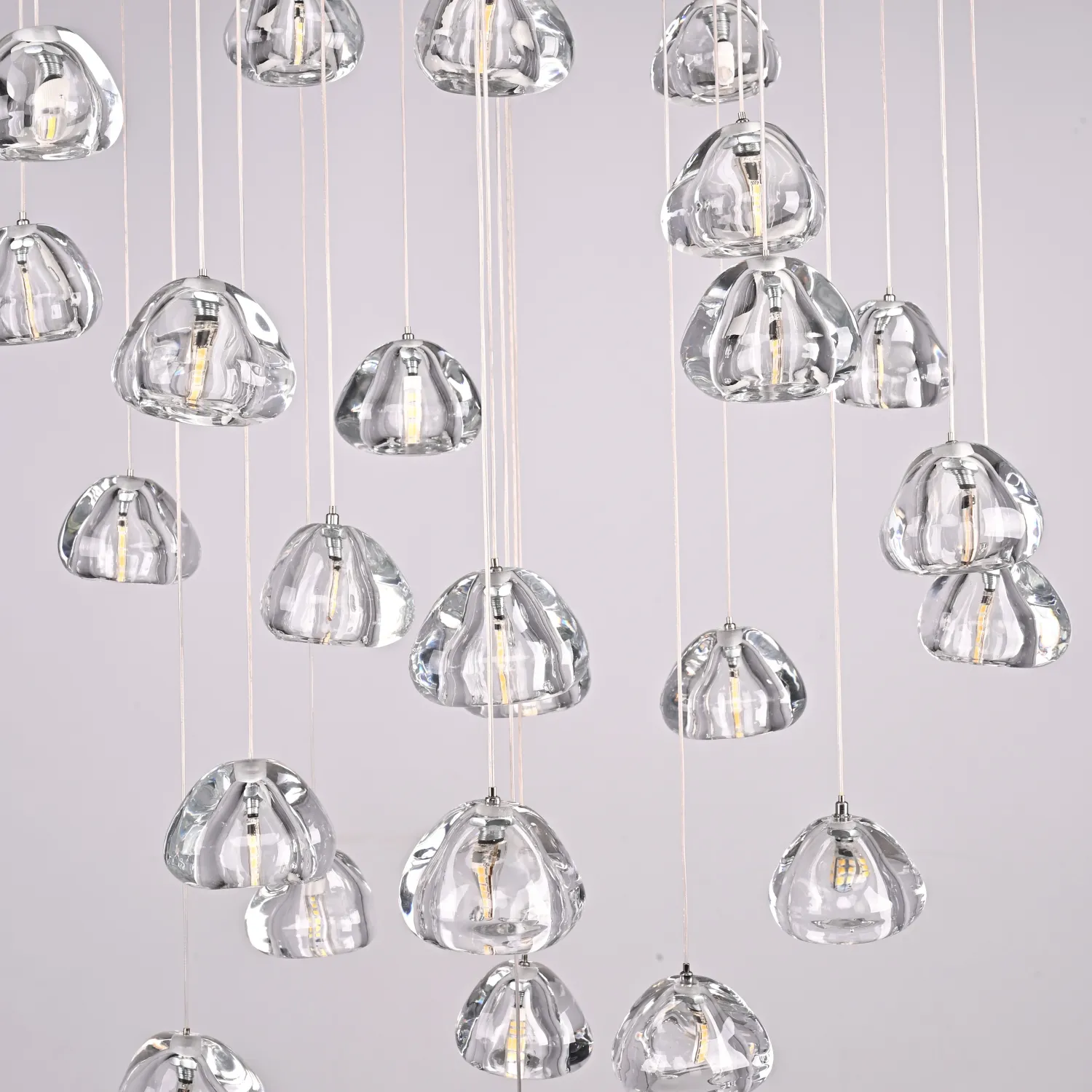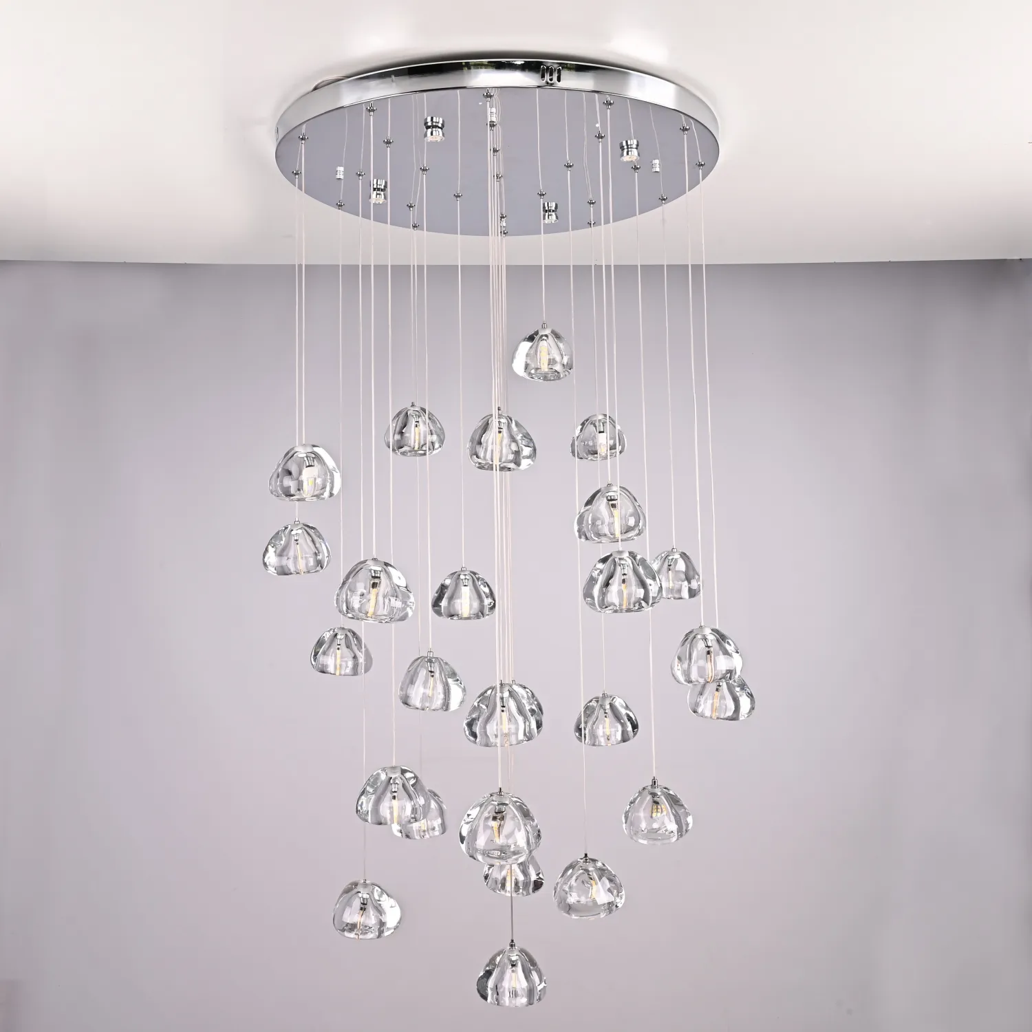 Светодиодный каскадный светильник с массивными стеклянными плафонами на общей потолочной плоскости. Дополнительные точечные светильники в основании, подсвечивают всю композицию и создают забавную игру преломления света. Встретим август каскадом падающих звезд. Выпускается на 3, 5, 7, 14 и даже 26 ламп. Так же по запросу возможно изготовить люстру любого размера с желаемым количеством подвесов. Подвесная люстра METEORA 26 - идеальное сочетание элегантности и функциональности для вашего интерьера! Эта потрясающая люстра станет настоящим украшением любого помещения. Сочетание изящного дизайна и высококачественных материалов делает ее непревзойденной в своем классе. Металлическая основа и кристальные подвески создают эффектный световой эффект, который добавит шик и роскошь в вашу обстановку. METEORA 26 имеет 26 лампочек, что обеспечивает яркое и равномерное освещение всего помещения. Вы сможете наслаждаться комфортной и приятной атмосферой в любое время дня. Эта люстра идеально подходит для гостиной, столовой или спальни. Она станет центральным элементом вашего интерьера, привлекая восхищенные взгляды гостей и создавая уютную атмосферу в вашем доме. METEORA 26 легко устанавливается и обслуживается. Она оснащена высококачественными компонентами, которые гарантируют долгий срок службы и надежную работу. Кроме того, она экономична и энергоэффективна, что позволит вам сэкономить на счетах за электроэнергию. Не упустите возможность добавить изысканности и роскоши в свой дом с помощью люстры METEORA 26. Покупайте сейчас и наслаждайтесь роскошным освещением, которое подчеркнет ваш неповторимый стиль и создаст непревзойденную атмосферу в вашем интерьере!
