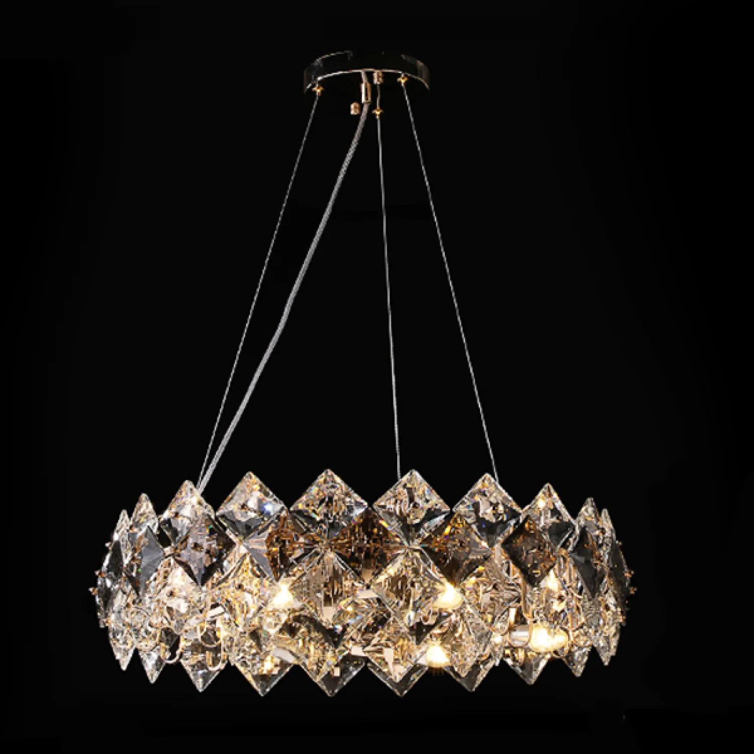 Люстра имеет 6 плафонов, выполненных из прозрачного стекла, которые подчеркивают яркость и чистоту света. Каждый плафон украшен кристаллами, которые придают ему изысканный и блестящий вид. Благодаря прозрачным элементам идеально рассеивается свет, создавая уникальные игры теней и отражений.
