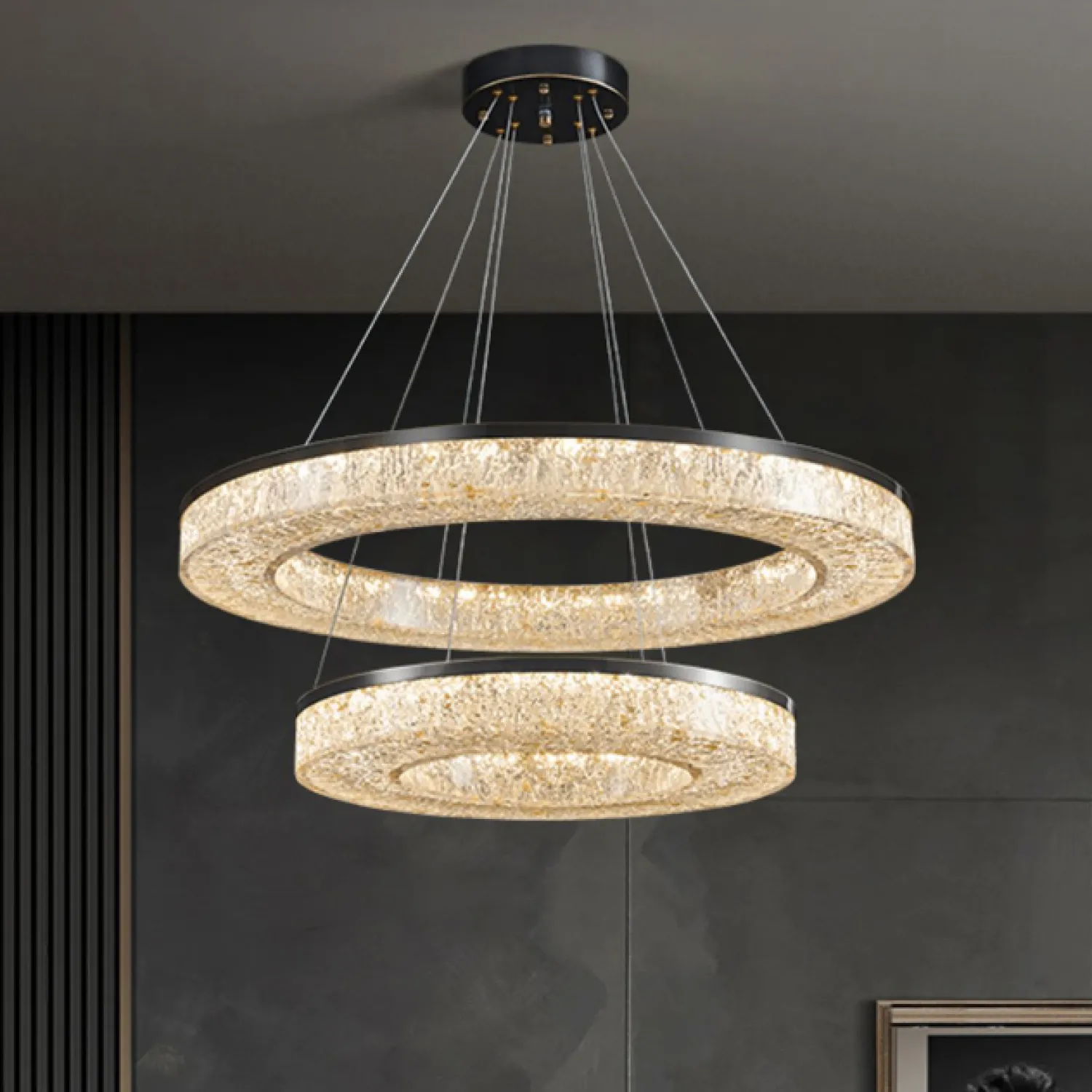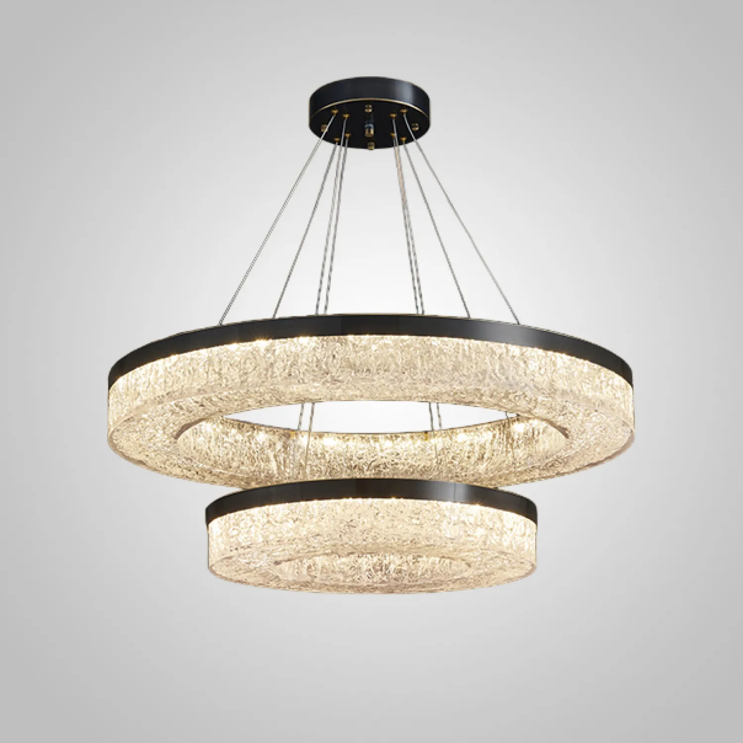 Изысканный дизайн идеально сочетает в себе классические формы и современные материалы. Металлическое кольцо черного цвета создает эффектное освещение и придает помещению изысканность и шарм.