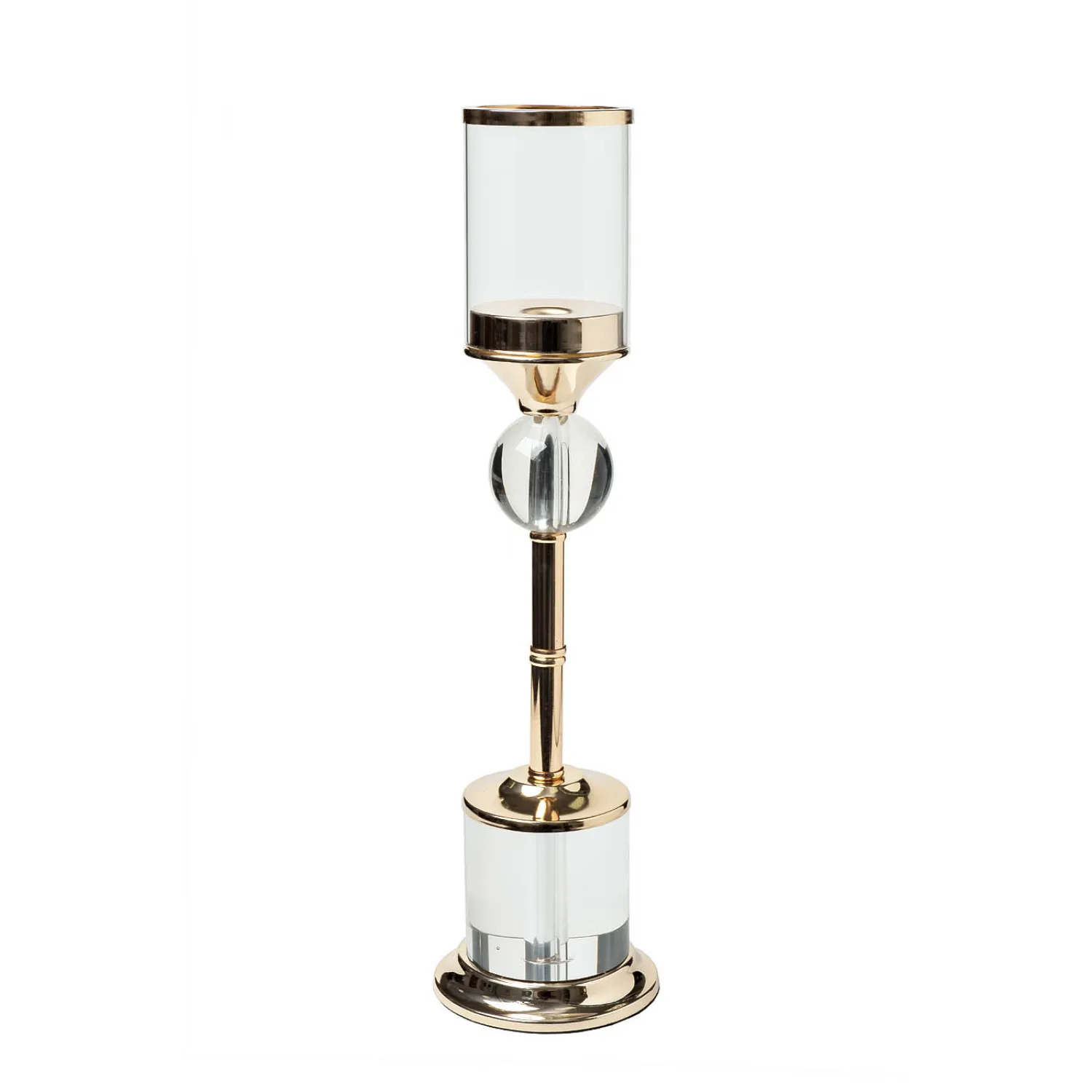 Изготовленный из качественного стекла и прочного металла, этот подсвечник обладает не только привлекательным внешним видом, но и высокой степенью долговечности. Золотистое покрытие металлической ножки придает ему особую роскошь и блеск, делая его настоящим украшением любого помещения.