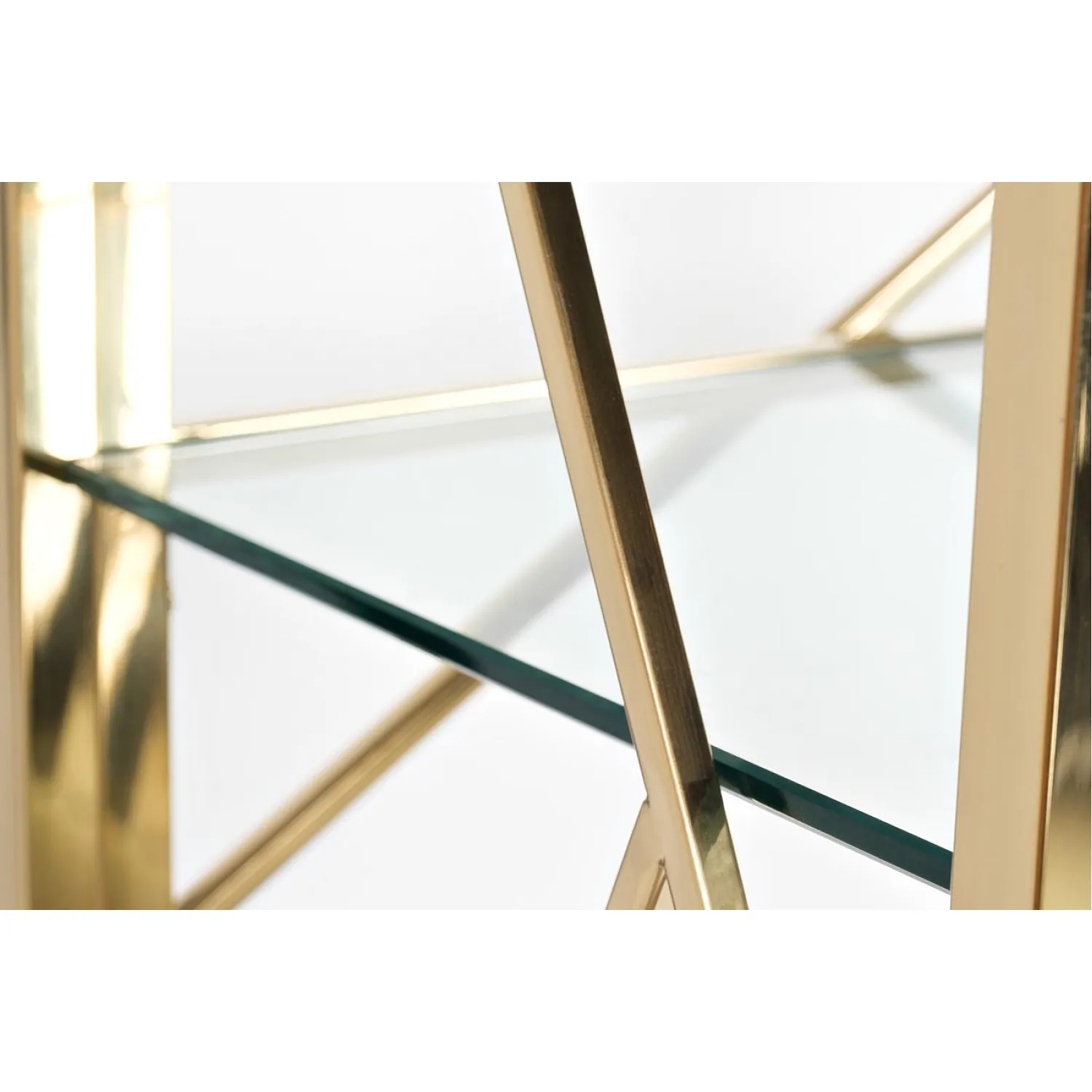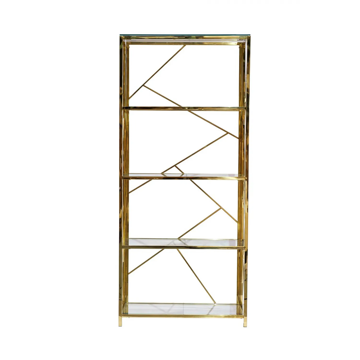 Этот стеллаж сочетает в себе элегантный дизайн и прочность, что делает его идеальным дополнением к любому интерьеру. Он изготовлен из высококачественного стекла, которое обеспечивает прозрачность и легкость, а также прочную металлическую раму с золотистым покрытием, которое добавляет шик и роскошь.
