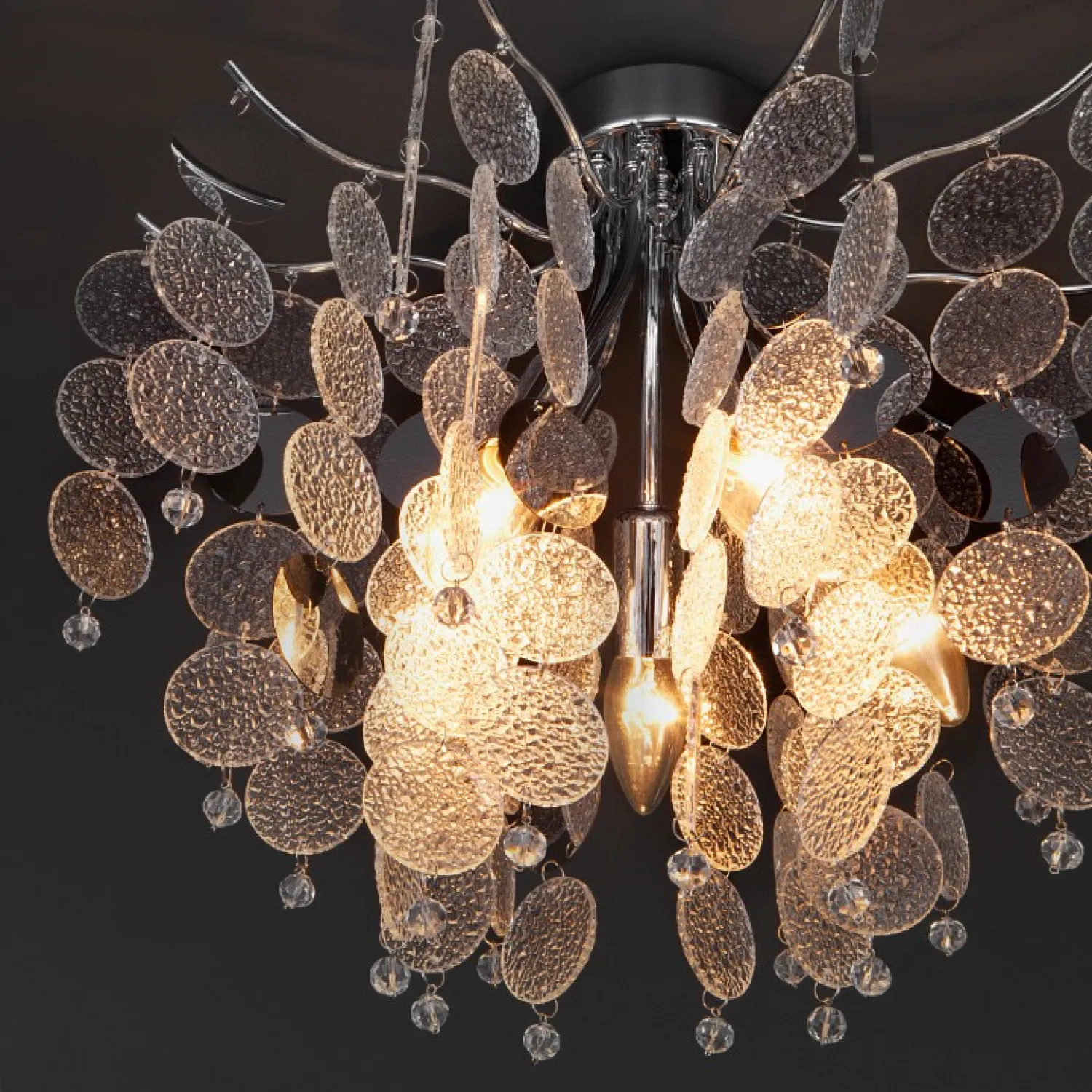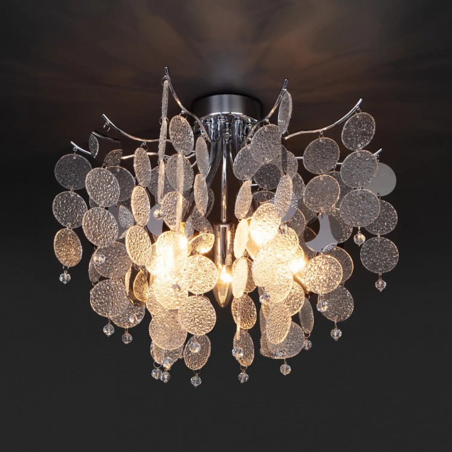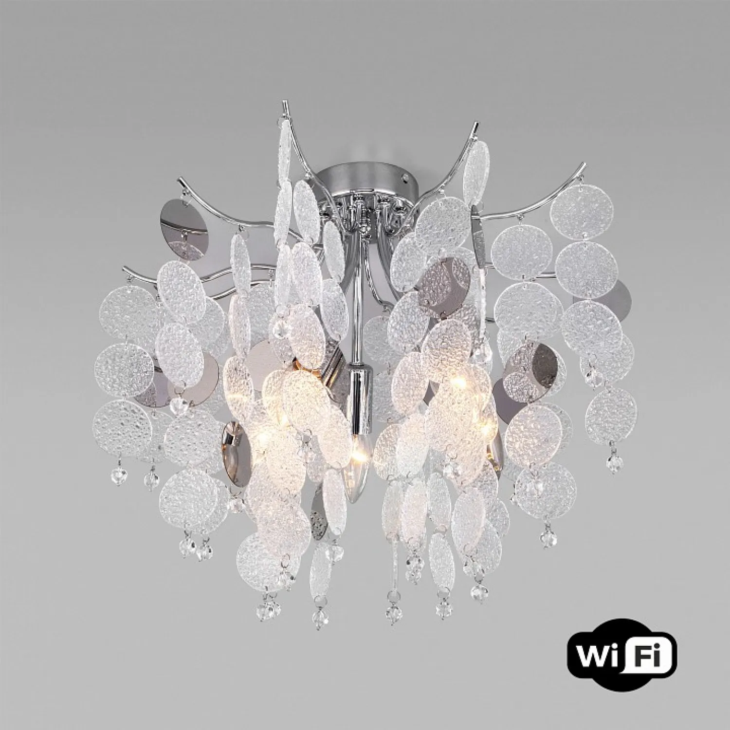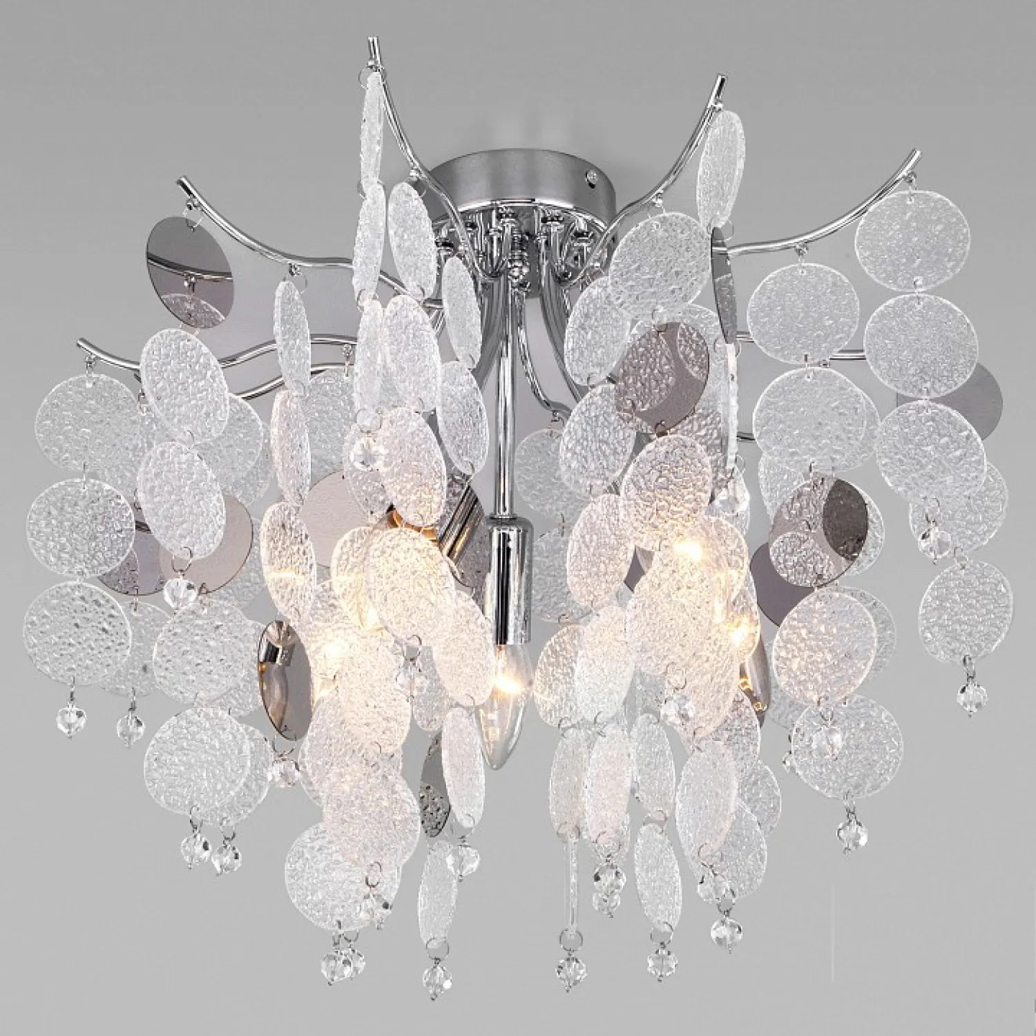 Эта потолочная люстра станет не только источником освещения, но и изысканным элементом декора вашего интерьера. Ее элегантный дизайн и хромированная отделка добавят шарма и роскоши в любое помещение.