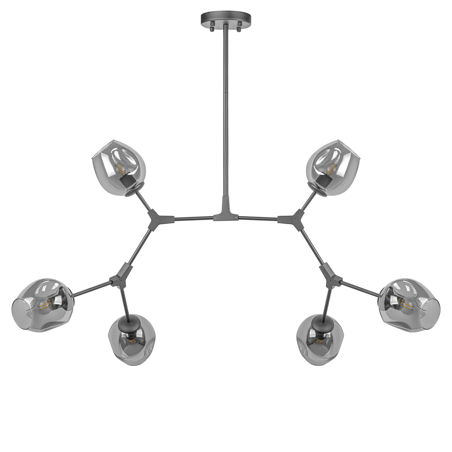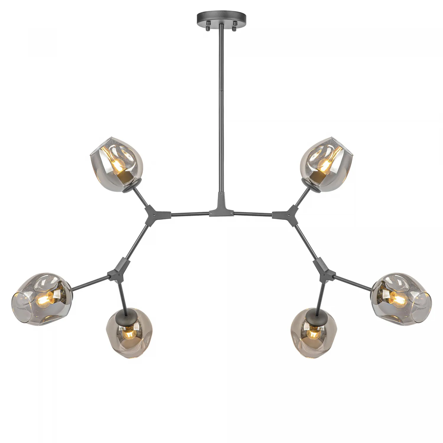 Люстра имеет шесть плафонов, выполненных из прозрачного стекла, которые прекрасно дополняют ее элегантный черный металлический корпус. Это создает эффектное сочетание материалов и придает люстре особый шарм.