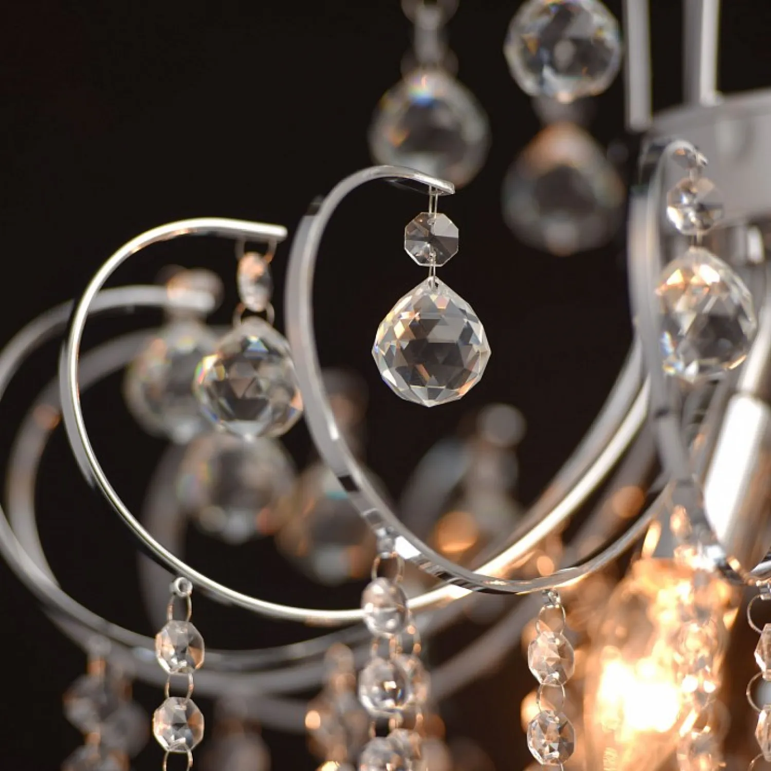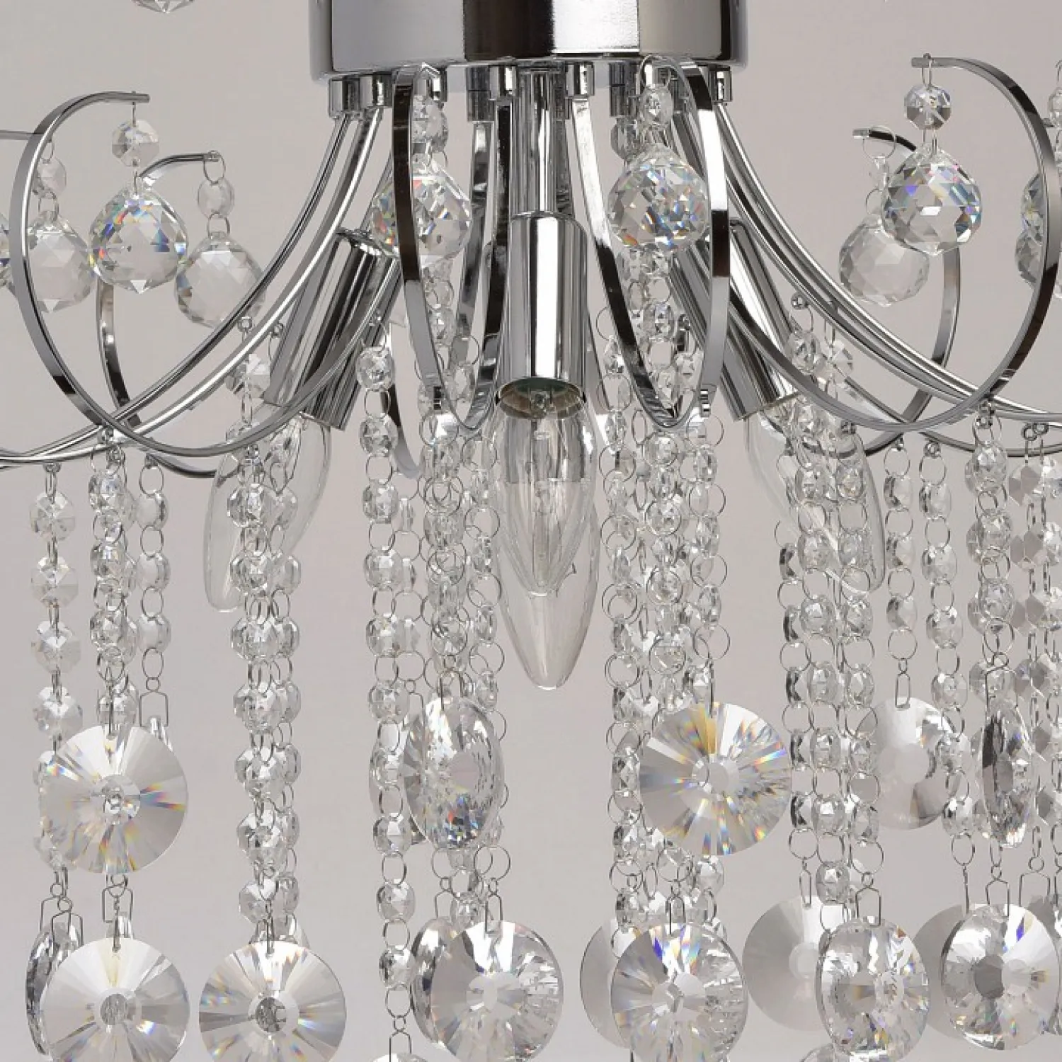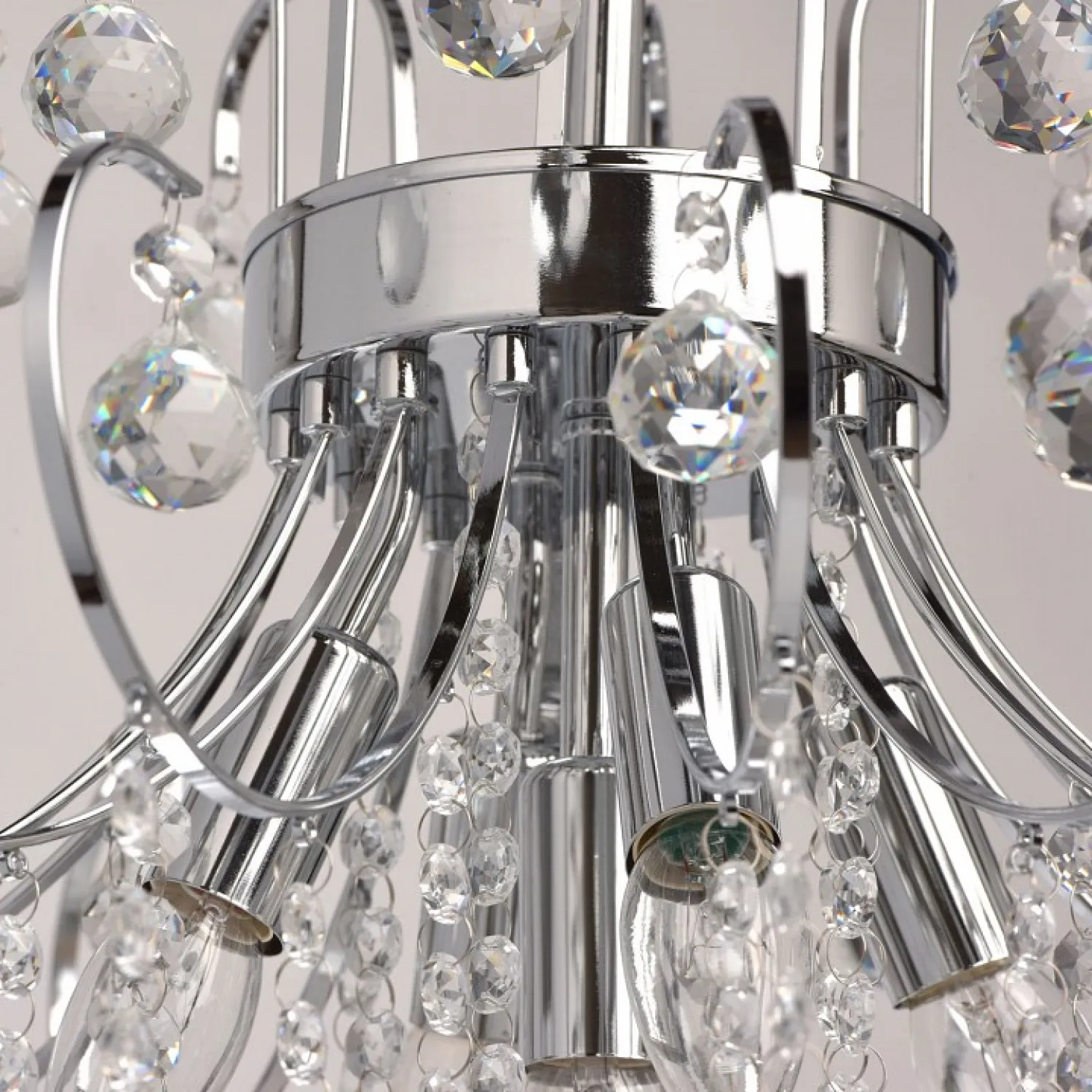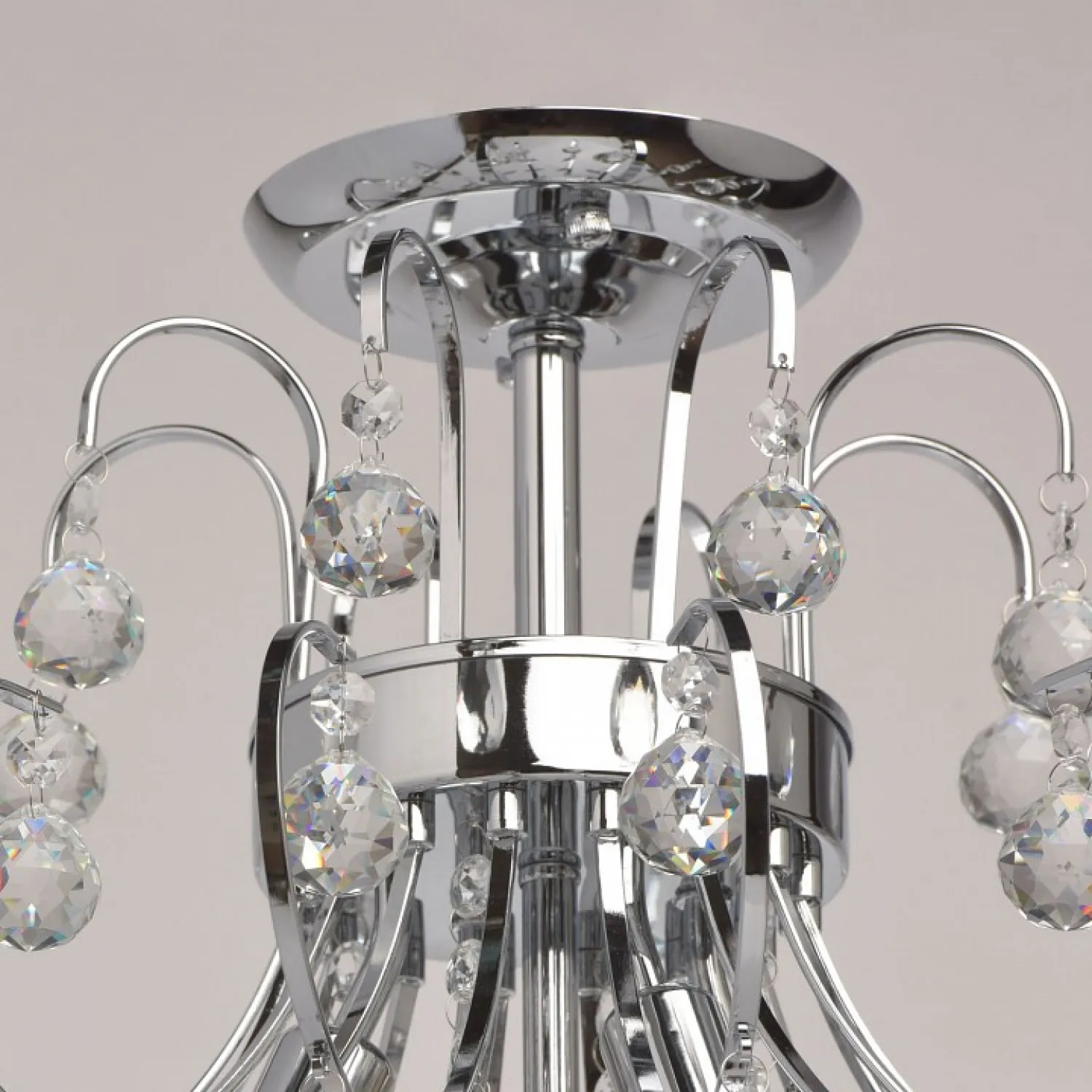 Арматура выполнена в хромированном цвете, что придает ей блеск и привлекательность. Этот материал надежен и долговечен, поэтому люстра прослужит вам долгие годы, не теряя своего первоначального вида.