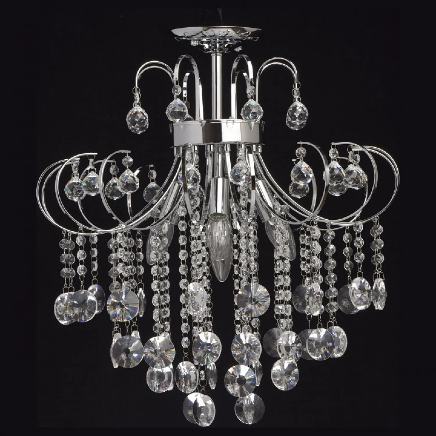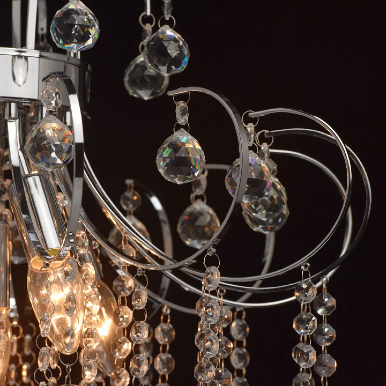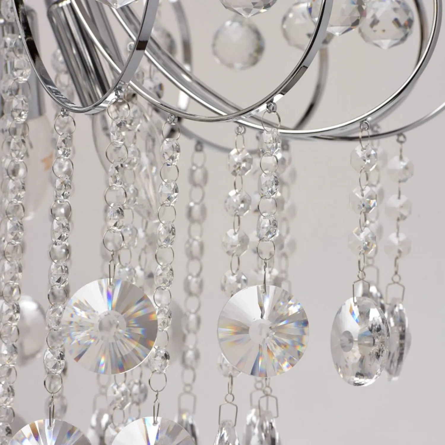 Арматура выполнена в хромированном цвете, что придает ей блеск и привлекательность. Этот материал надежен и долговечен, поэтому люстра прослужит вам долгие годы, не теряя своего первоначального вида.