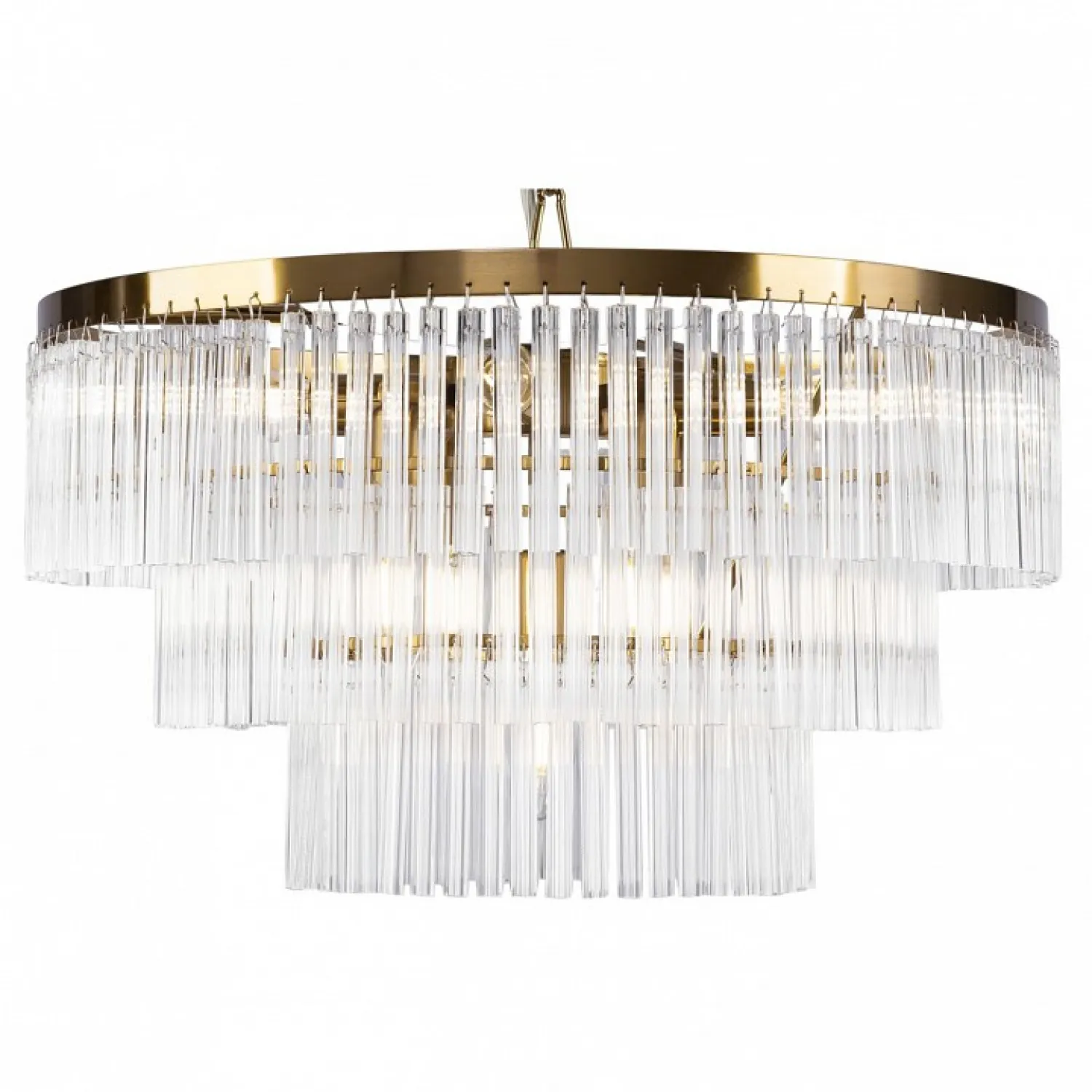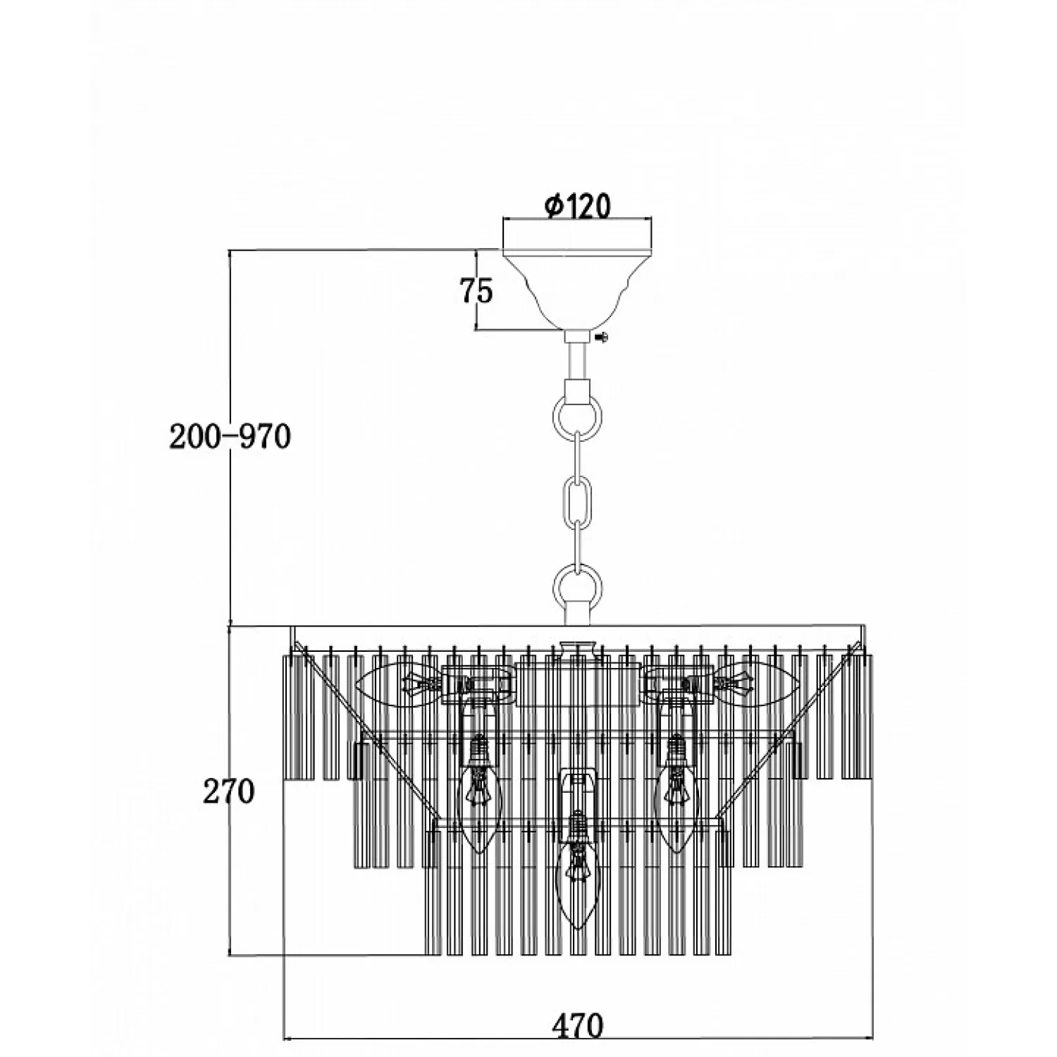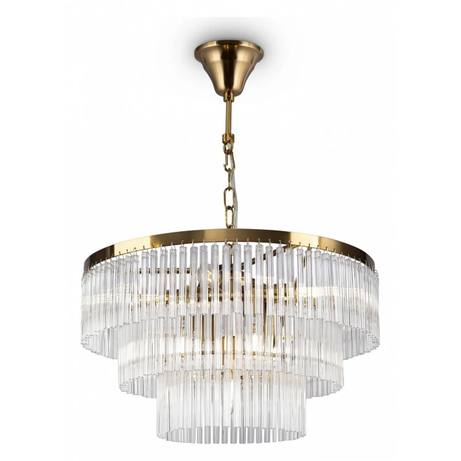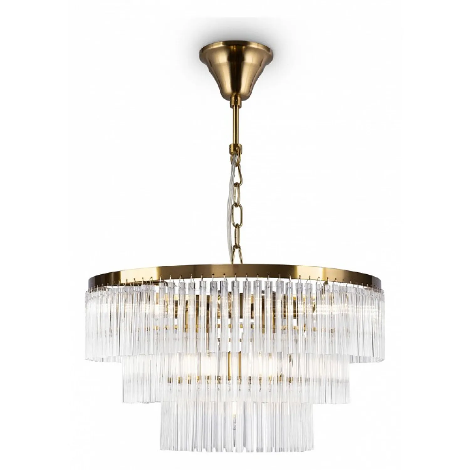 Состоящая из девяти подвесных плафонов, эта люстра обеспечивает яркое и равномерное освещение в помещении. Плафоны выполнены из прозрачного стекла с эффектом кристаллов, которые создают игру света и отражений, добавляя воздушности и изысканности.
